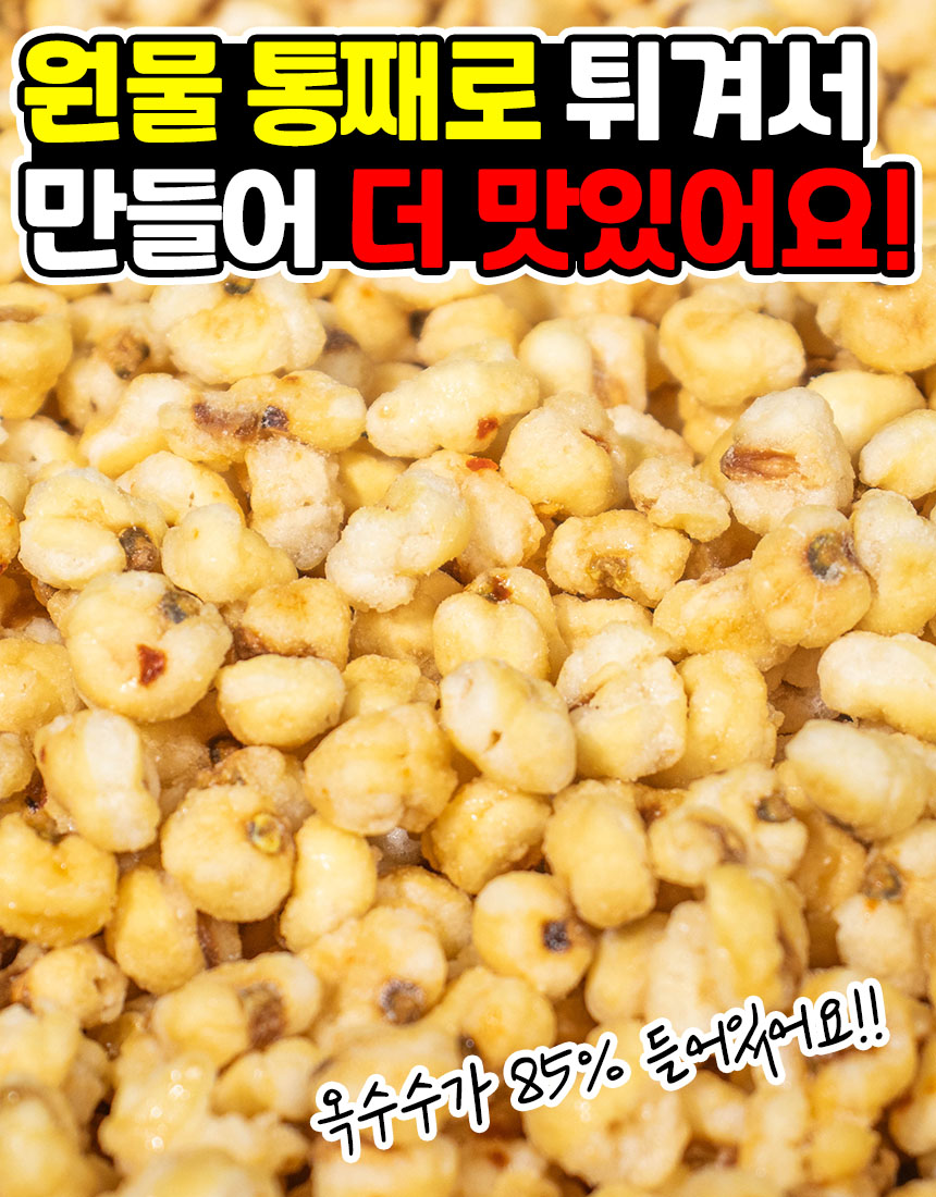 원재료명 및 함량 : 옥수수 85%(유전자변형 옥수수 포함 가능성 있음), 설탕, 팜올레인유, 정제소금, L-글루탐산나트륨(향미증진제), 고추