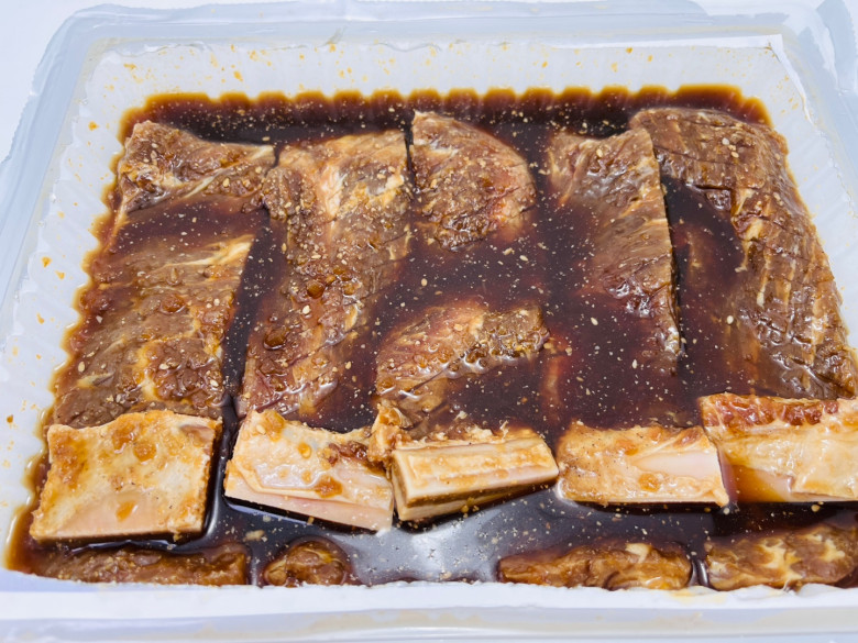 ※ 성분표시 : 소정육(호주산)49%, 소갈비뼈(미국산)11%, 몽고간장(탈지대두(인도, 미국, 중국), 천일염(호주), 소맥카라멜색소(천연첨가물))5.4%, 설탕, 물엿, 옥수수전분(러시아), 소주, 미향, 후추(천연향신료(베트남)), 땅콩, L-글루탐산나트륨(향미증진제), 참깨(인도산), 참기름(인도산), 푸드바인드(난백(프랑스, 중국), 감자전분(독일, 덴마크)), 파인애플, 마늘, 양파, 배