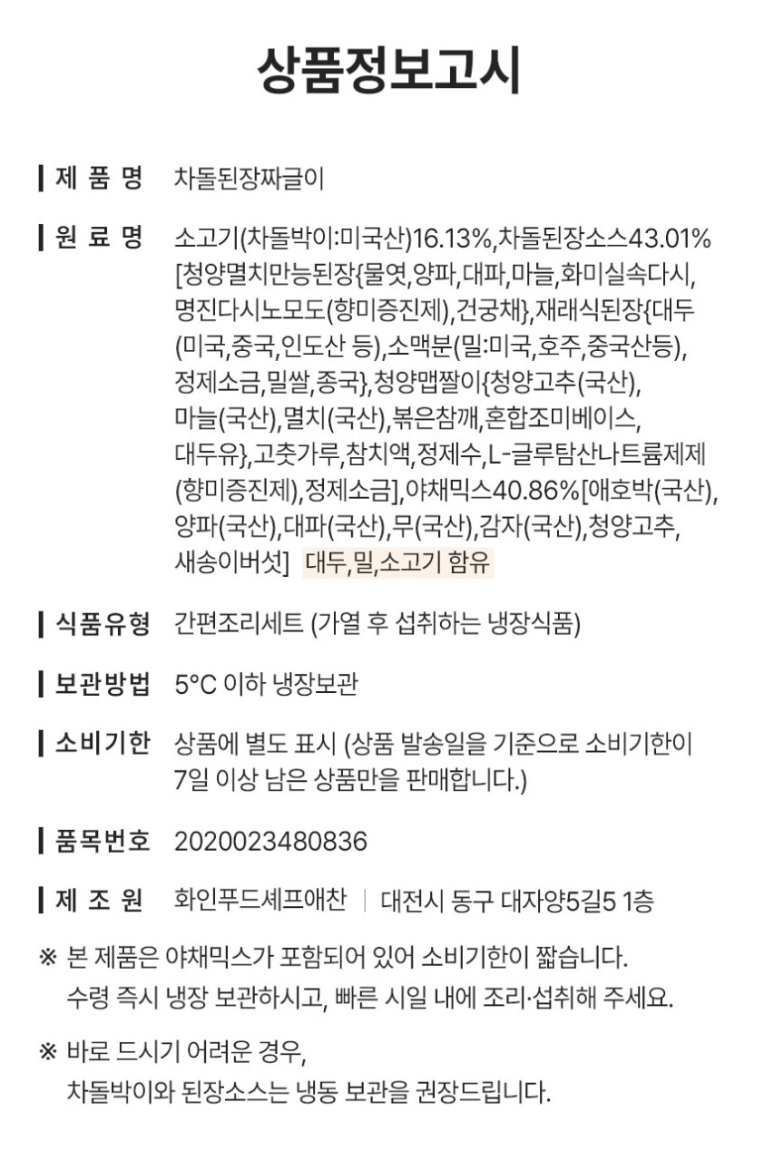 📍차돌된장짜글이 1세트(930g) 12,900원