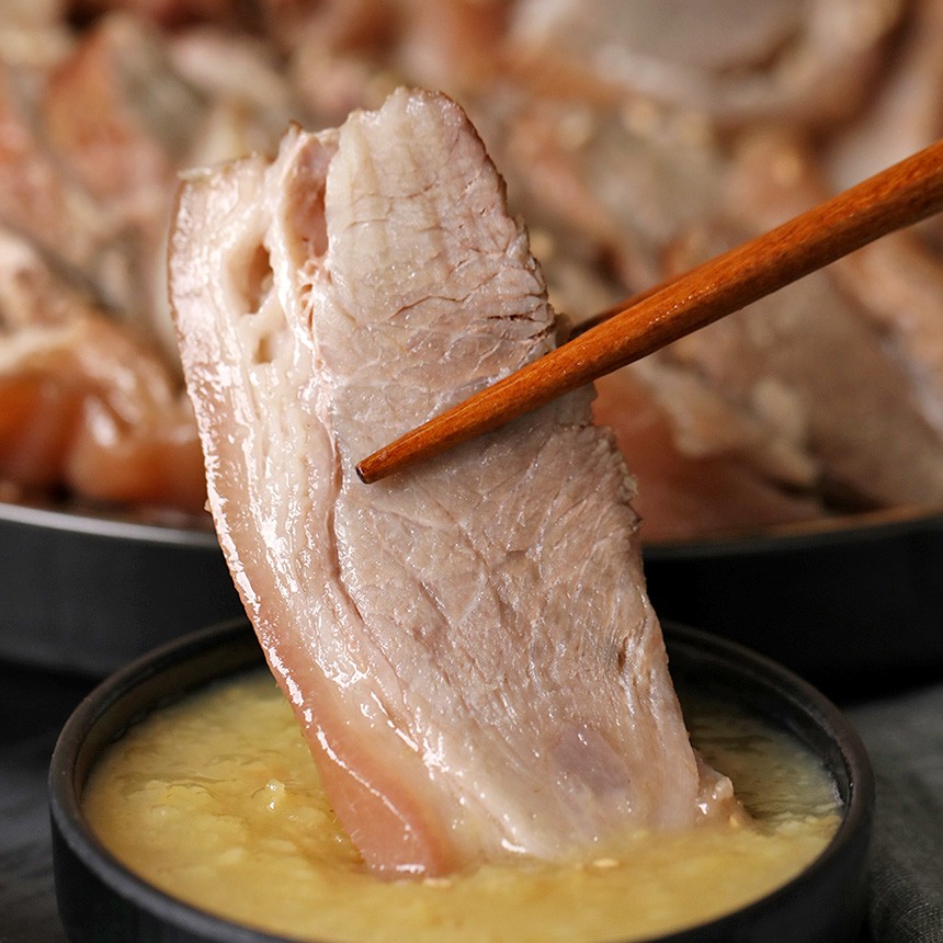 ✔️조리방법 : 물 1.5L에 비법소스, 고기를 넣고 한번 끓고 난 후 뚜껑을 덮고 중불로 1시간 동안 삶아주면 맛있는 수육보쌈이 완성됩니다.