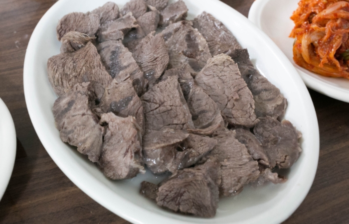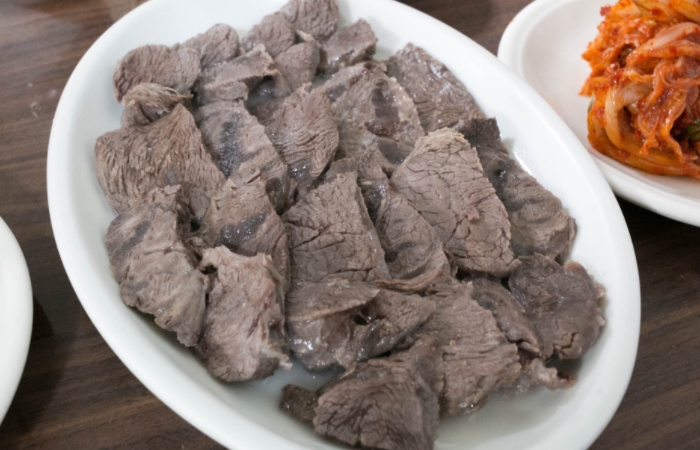 그 오돌돌한 식감의 힘줄을 간장소스에 찍어먹으면 맛있어요.