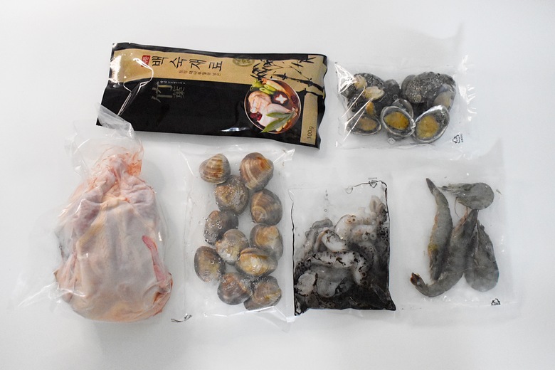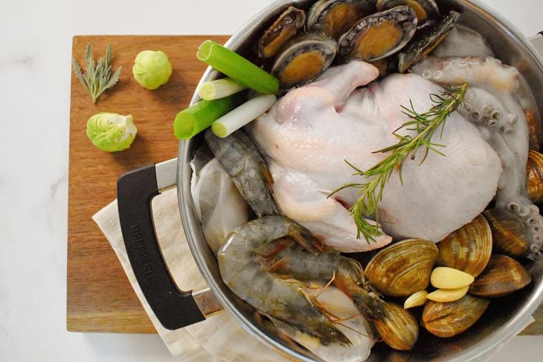※ 중량/사이즈 : 생닭 1kg, 냉동문어 200g~400g, 냉동전복 200g 2-10미 내외, 백상합 500g, 냉동흰다리새우 4미, 약재 1팩