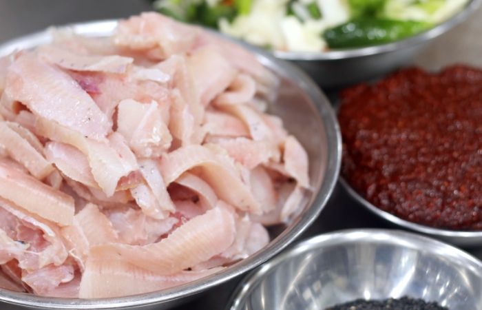 도톰하게 썰어낸 오돌오돌 홍어회와